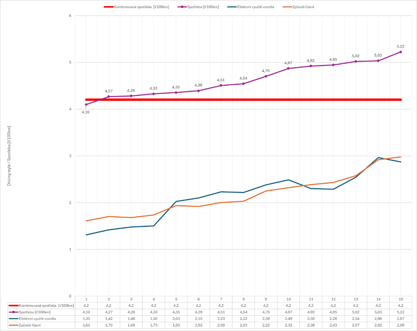 - Výsledok: Zhoršenie hodnotenia štýlu jazdy o jeden bod (na stupnici od 1 do 5) bolo charakterizované častým rýchlym zrýchľovaním, necitlivým brzdením alebo nekonzistentnou rýchlosťou. To viedlo k zvýšeniu spotreby paliva až o 25 %.